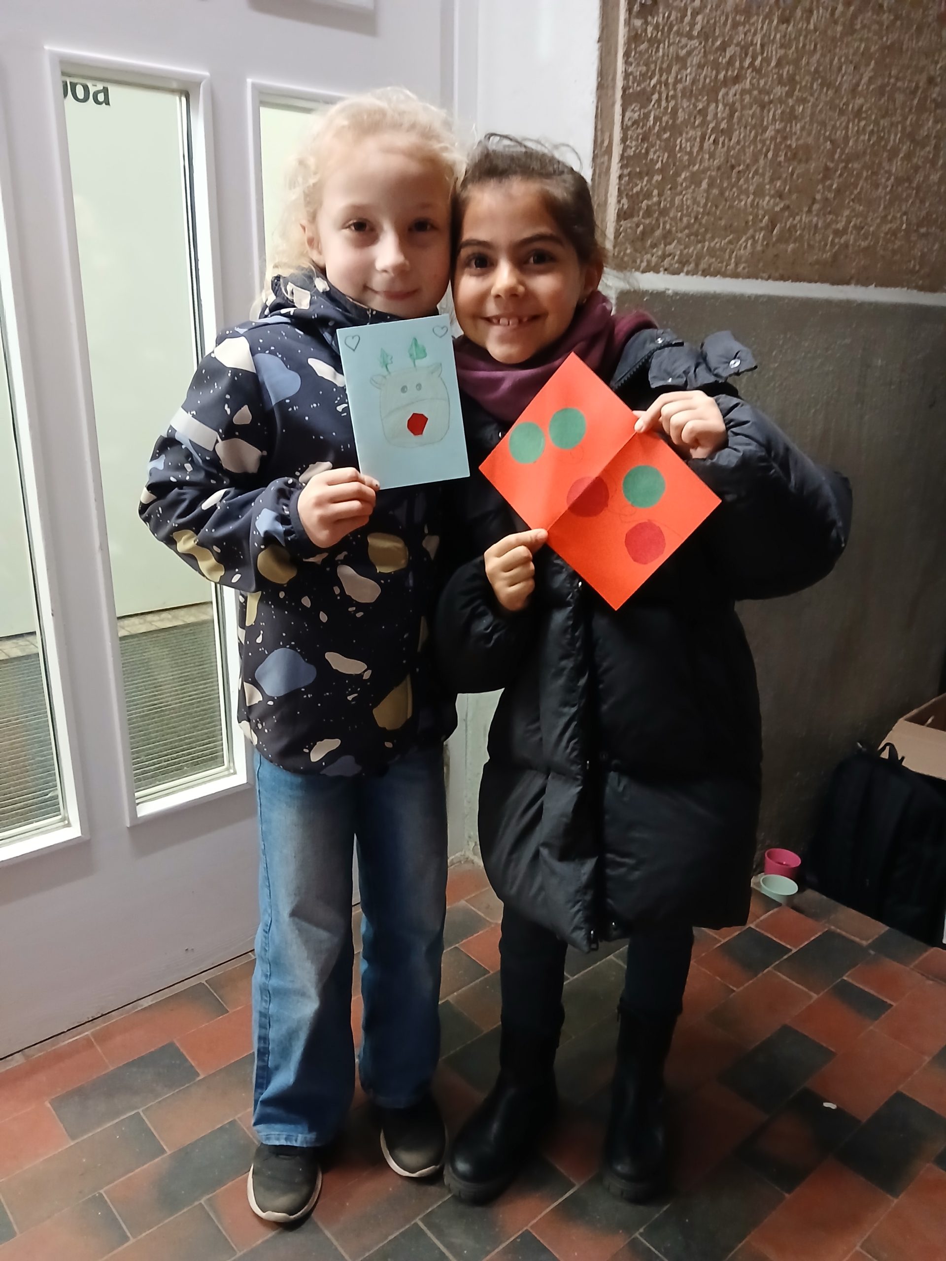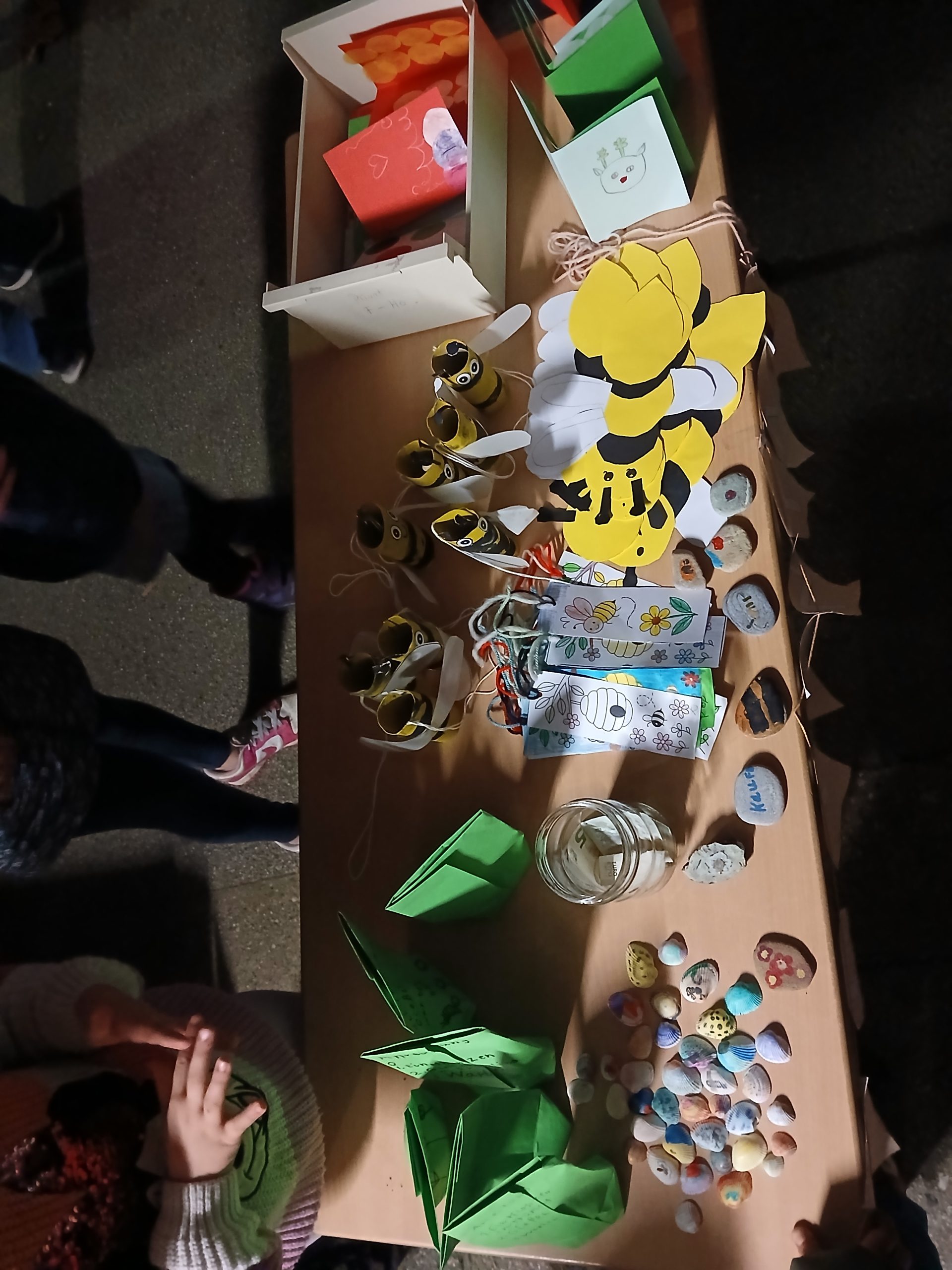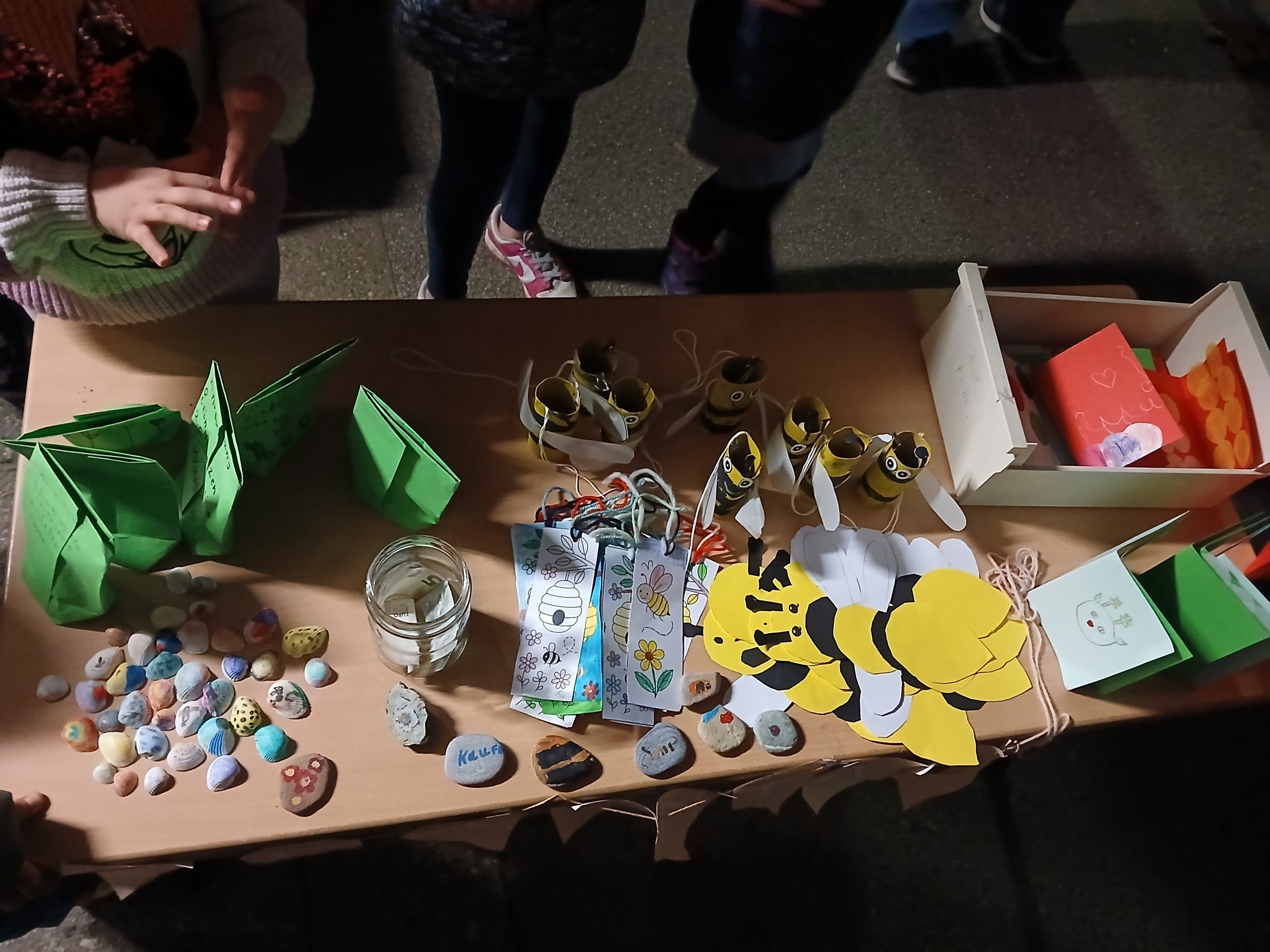 Die Kinder der Klasse 2a hatten einen Verkaufsstand mit liebevoll gebastelten Kleinigkeiten aufgebaut. Lustige Bienen aus Klopapierrollen, bemalte Steine und selbst gestaltete Weihnachtskarten wurden zum Verkauf angeboten. Das Besondere daran: Der Erlös geht an die Aktion „Weihnachtswunder“ von WDR 2.