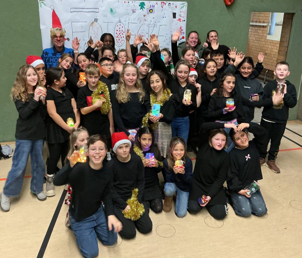 Zum Abschluss wurde es noch einmal sehr besinnlich. Die vierten Klassen hatten Gläser bunt beklebt, mit einer Kerze versehen und führten in der abgedunkelten Halle einen stimmungsvollen Lichtertanz zum Lied „Weihnachten auch für dich“ auf.