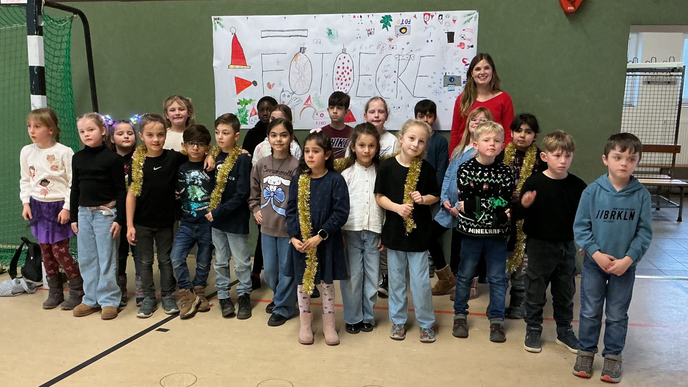 Als Erstes bot die Klasse 3b eine Vorführung zum Lied „Der Bratapfel“. Im Einheitslook mit Weihnachtsmützen und farblich passender Kleidung sangen und tanzten sie eine tolle Performance.