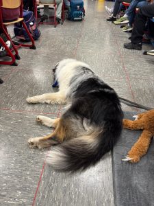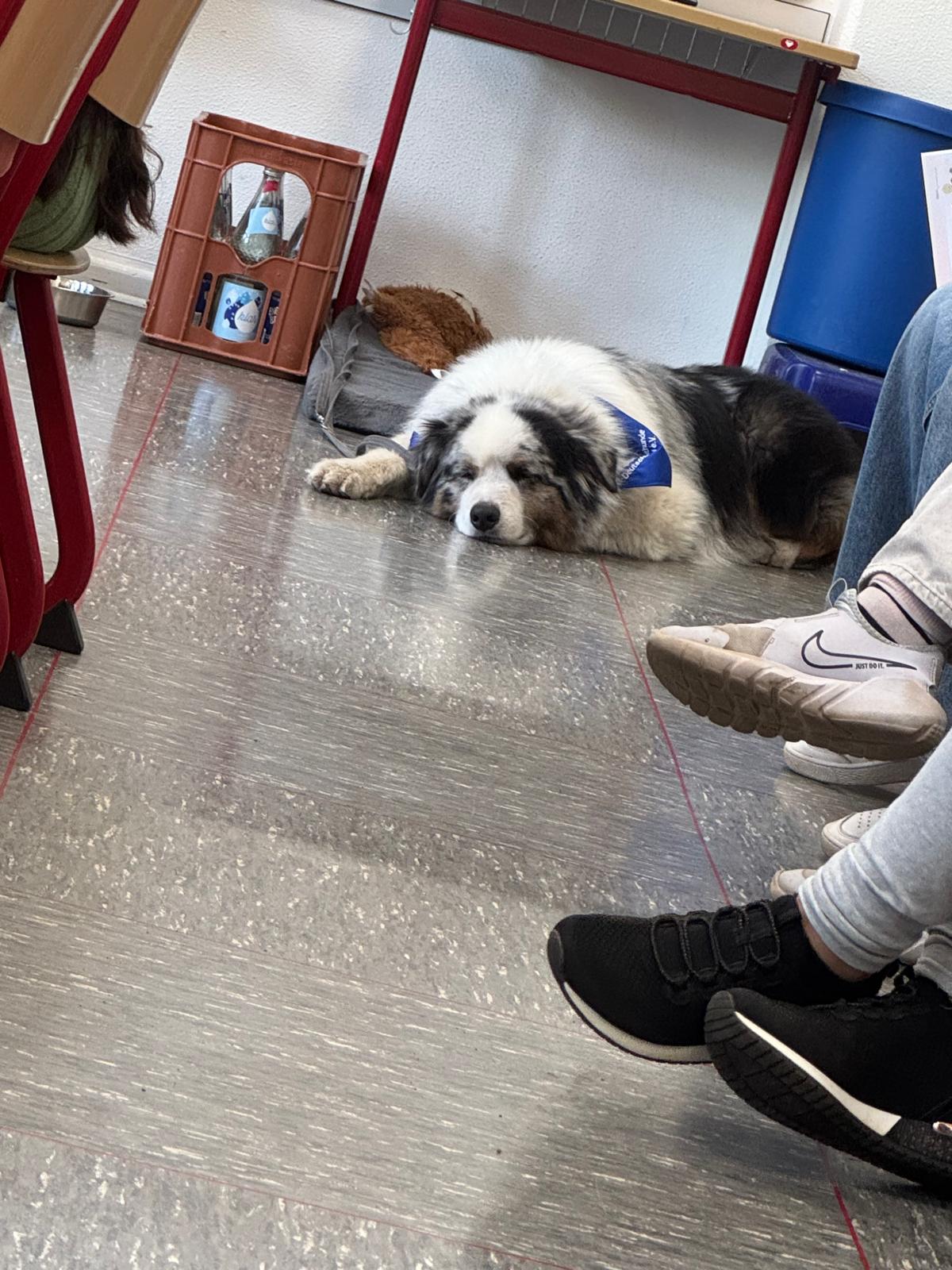 Schulhund Mailo begleitet derzeit gemeinsam mit unserer MPT-Kraft Frau Flicke die Klassen 3a und 3b durch den Schulalltag. Er ist für die Kinder zu einer großen Bereicherung geworden und genießt es, während des Unterrichts faul unter dem Tisch zu dösen und sich hin und wieder Streicheleinheiten abzuholen.