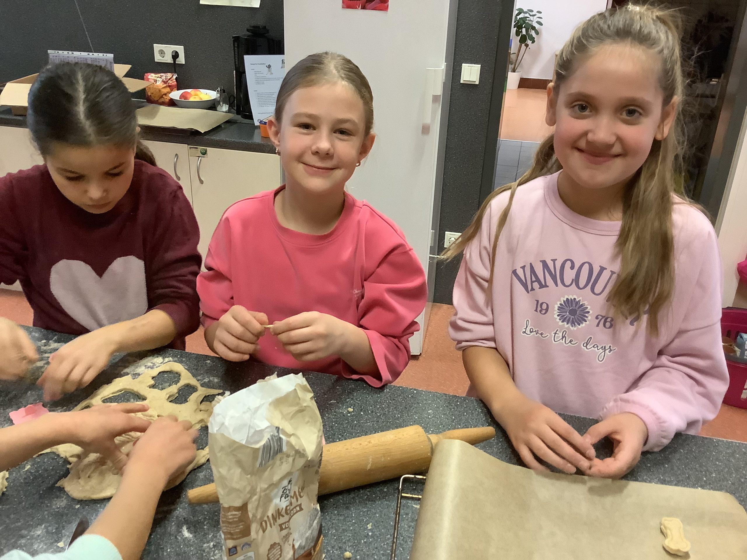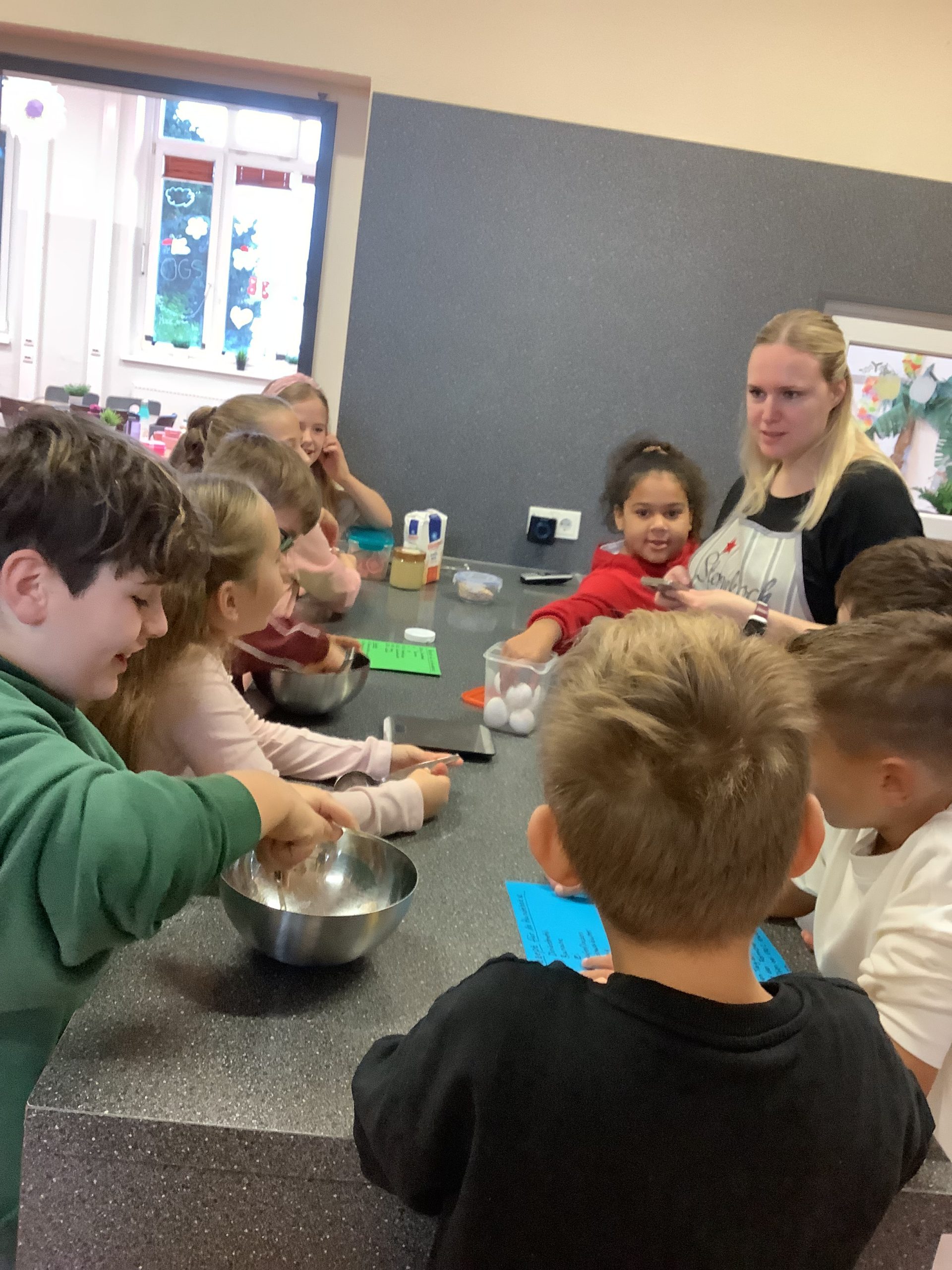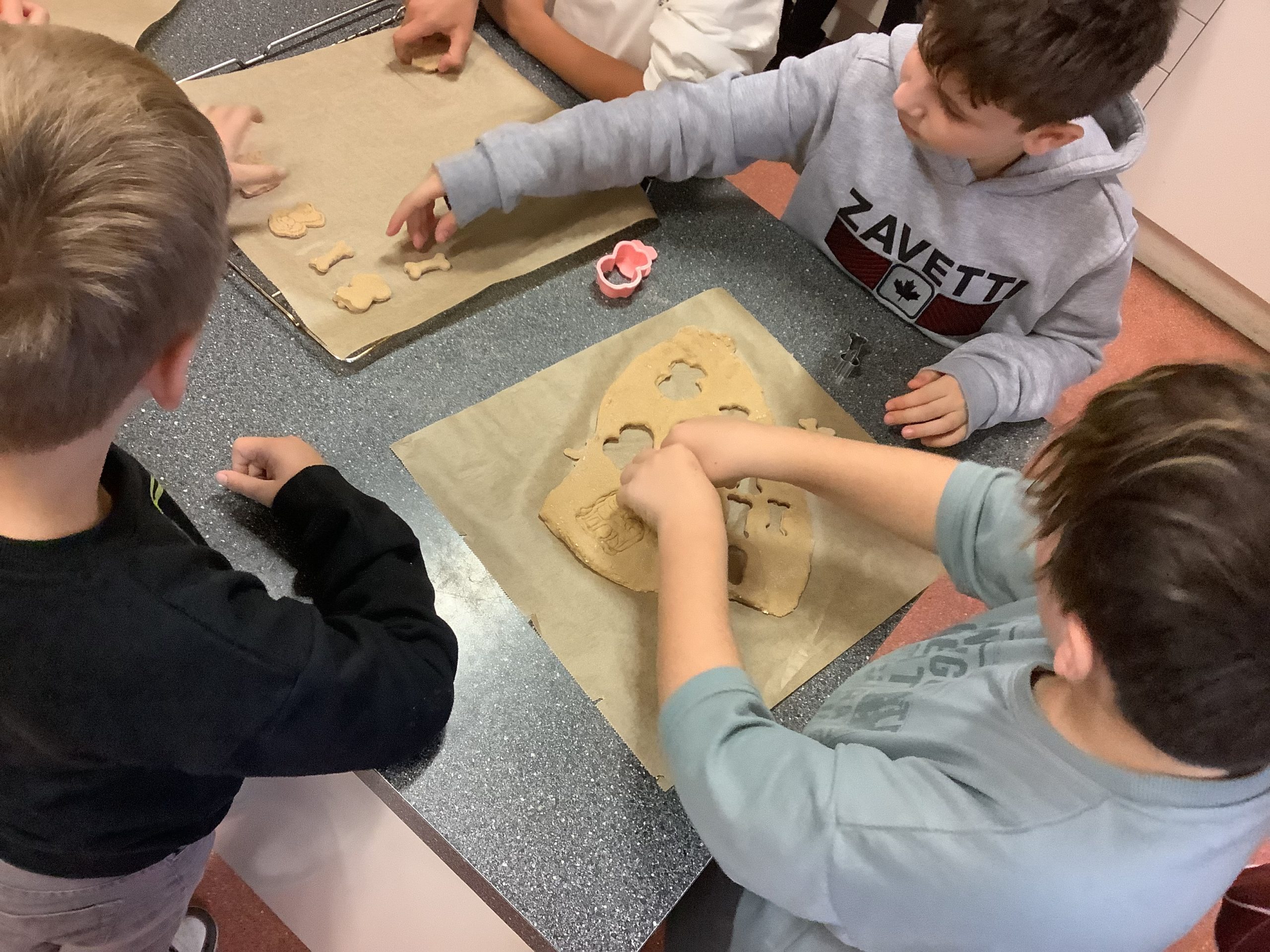 Zusammen mit Klassenlehrerin Frau Gwenner und Frau Flicke überlegte sich die Klasse 3b, wie sie Mailo eine Freude bereiten könnte. Und da Hunde bekanntlich Leckerchen lieben, beschloss die Klasse, Hundekekse für Mailo zu backen.