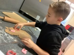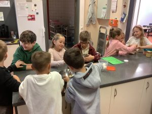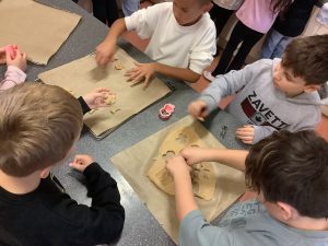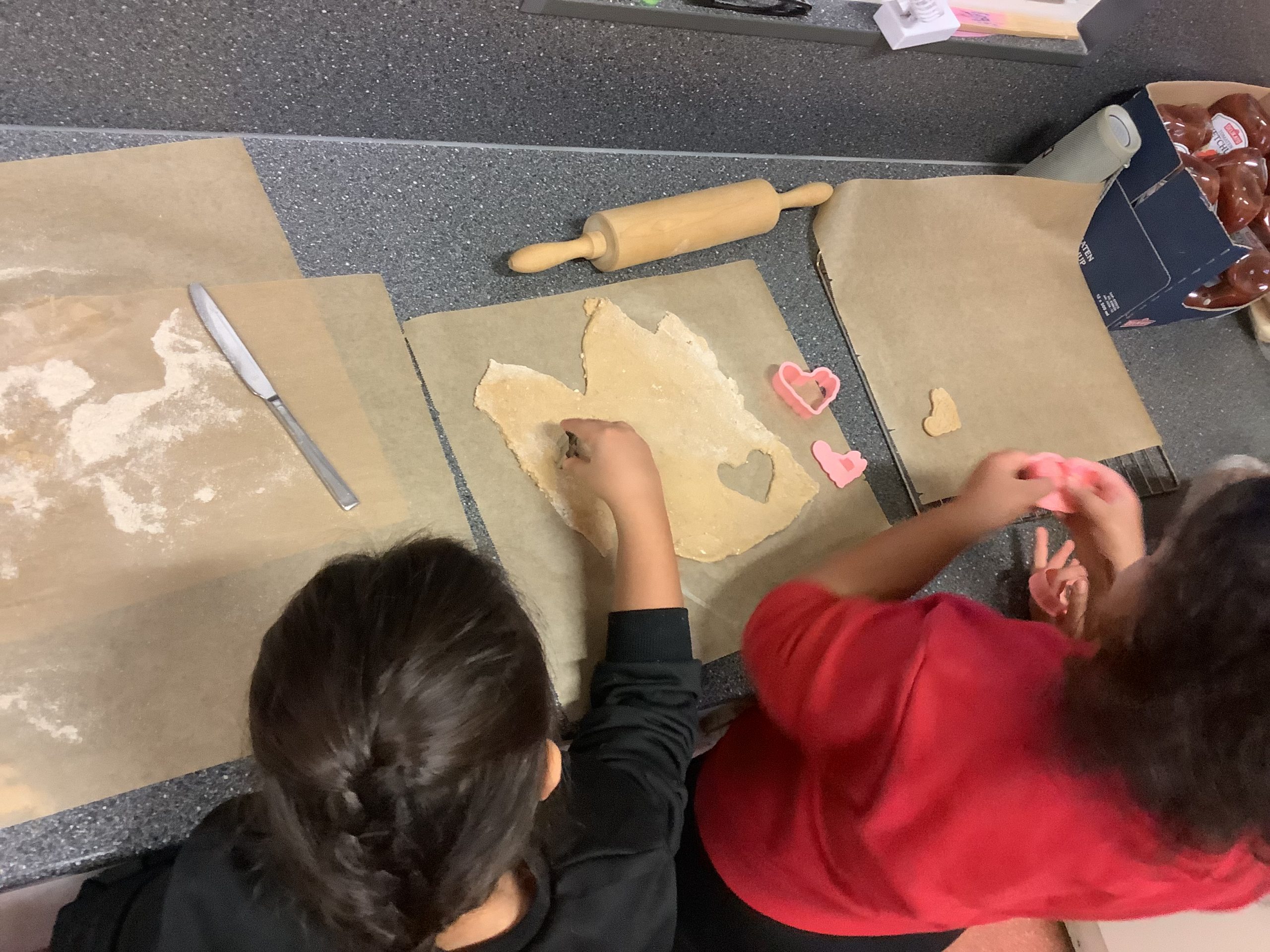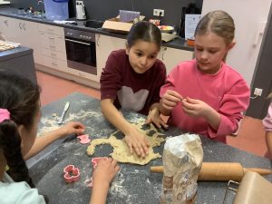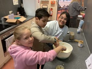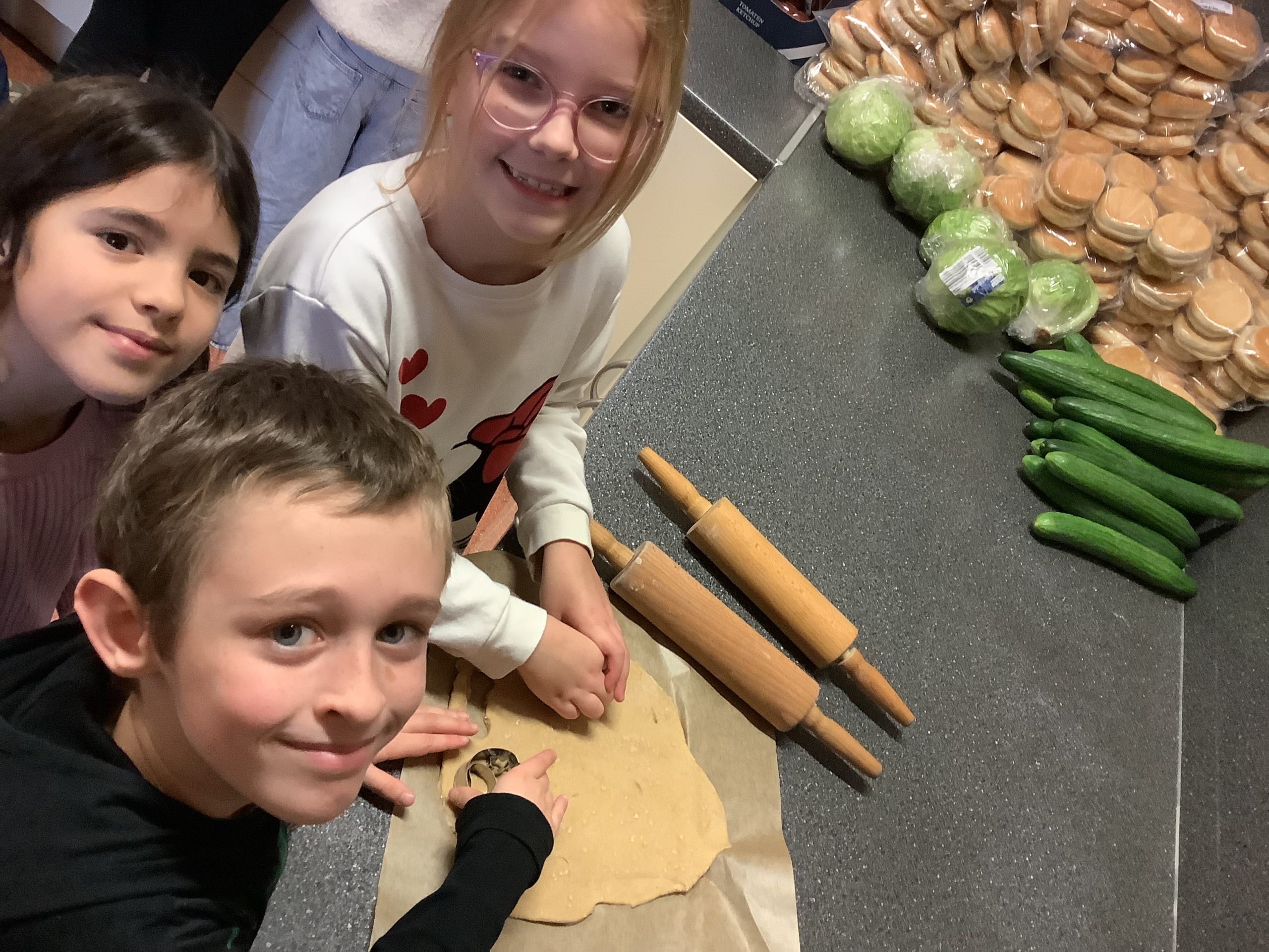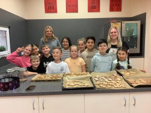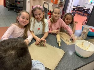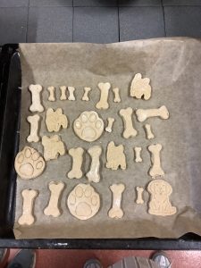 Zusammen mit Klassenlehrerin Frau Gwenner und Frau Flicke überlegte sich die Klasse 3b, wie sie Mailo eine Freude bereiten könnte. Und da Hunde bekanntlich Leckerchen lieben, beschloss die Klasse, Hundekekse für Mailo zu backen.