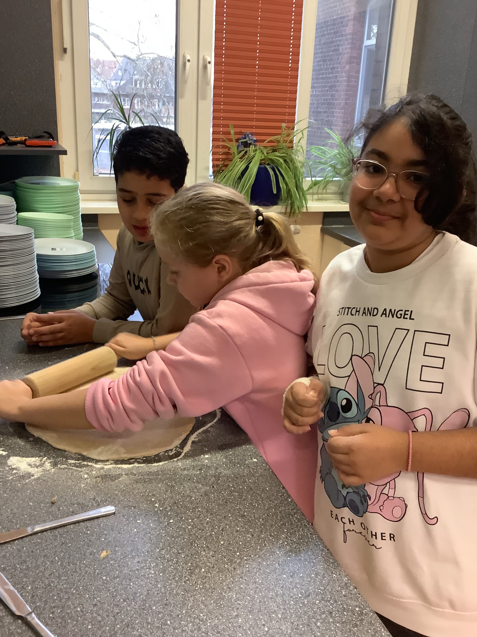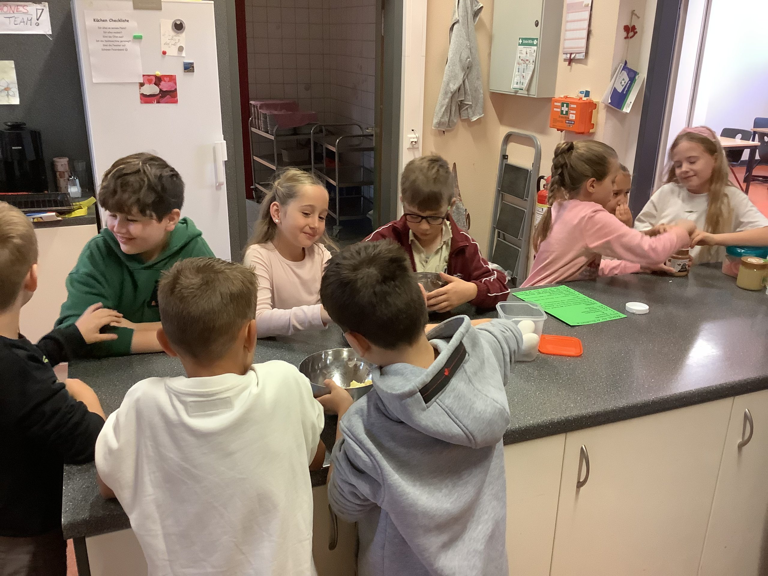 Aus Dinkelmehl, Bananen, Eiern, Haferflocken, Erdnussbutter, Honig und Wasser zauberten die Kinder gemeinsam in der Küche der OGS leckere Köstlichkeiten für Mailo.